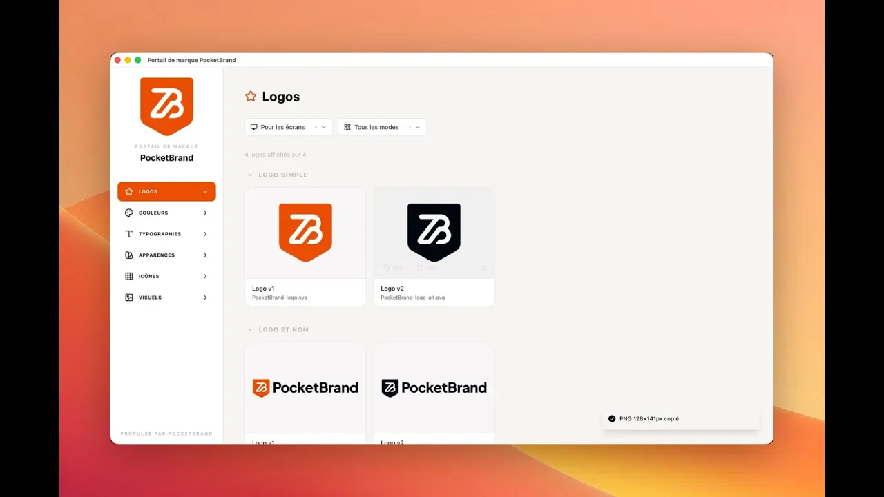 SVG-first : chargez 1 SVG, et toutes les tailles de PNG sont générées. Définissez le contexte light ou dark, le profil web ou print, créez des rubriques. Le client copie la version qu'il lui faut en 1 clic.